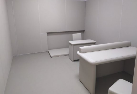 留置室防撞软包:采用基材具有防火阻燃功能的高弹性聚乙稀发泡棉,饰面采用原材料阻燃的皮革,两者进行无胶复合方法制造而成。其饰面皮革颜色为浅灰色和米黄色,规格为宽度1250mm,高度2450mm。总体厚度具有20mm、25mm、30mm。采用软质硅胶收边条进行收边处理,底座固定收边条。材料符合国标B1级阻燃,E0级环保,并且安装方法简单易懂,只需要采用环保水性白乳胶进行安装即可。